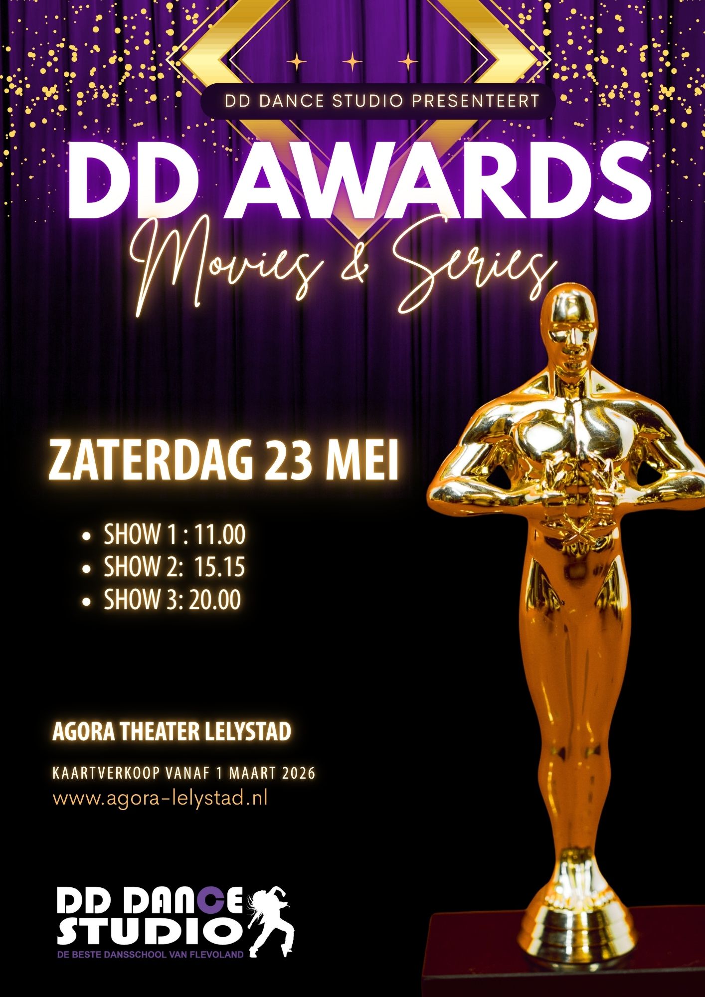 Op 23 mei 2026 gaat in het Agora-theater het jaarlijkse spectakel weer plaatsvinden. Verdeeld over de dag zullen in 3 voorstellingen meer dan 500 dansers van DD Dance Studio weer sheinen op het grote podium.